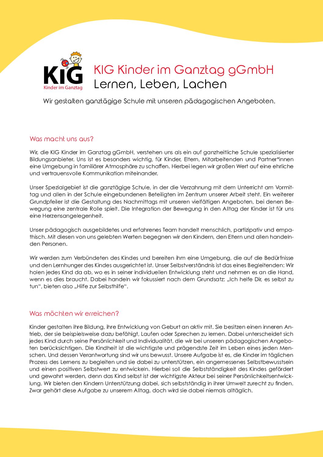 Wir, die KIG Kinder im Ganztag gGmbH, verstehen uns als ein auf ganzheitliche Schule spezialisierter Bildungsanbieter. Uns ist es besonders wichtig, für Kinder, Eltern, Mitarbeitenden und Partner*innen eine Umgebung in familiärer Atmosphäre zu schaffen. Hierbei legen wir großen Wert auf eine ehrliche und vertrauensvolle Kommunikation miteinander.